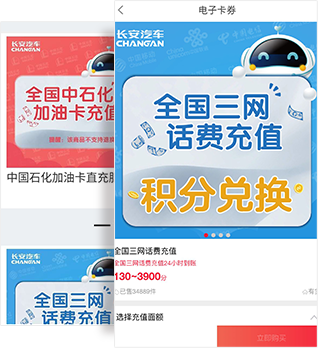 橙券长期与长安汽车进行合作,是长安商城虚拟电子卡券业务提供商之一,为其提供商城积分兑换资源,包含权益充值、各类电子卡券等多类型产品。利用橙券资源整合能力,不定期增加兑换产品,丰富用户选择,有效的提升了用户留存率,加强用户对企业的友好度。
